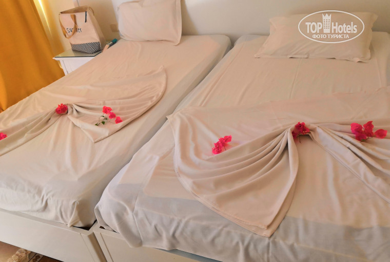 Началось все как у всех с заселения. Отдыхали с подругой, изначально просили номер dbl ещё в агентстве и ваучере было написано 2х местный номер. Дали с 1 ой большой, советских времен)мы испытали стресс. сфоткать не успели пошли менять номер , пришлось "подмазать" администратора. И номер нам дали хороший, чистый с ремонтом, каждый день уборщица убирала и красиво выкладывала цветочки на кровати. Конечно в номере шумоизоляции не было, и ночью мы слушали музыку из ночного клуба напротив. Конечно, отелю до 4* далеко, скорее сойдёт на 3*