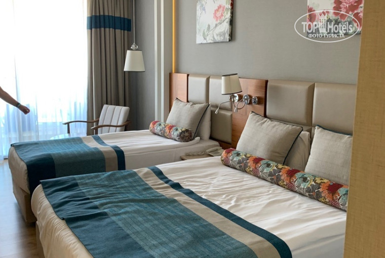 НОМЕР . Чистый ,просторный ,для двоих прям отлично. Уборка каждый день.За 7 дней меняли постельное белье . Полотенца были всегда . Очень приятно ,когда приходишь с пляжа ,а в номере чистенько ,полы чистые и прохлааадно))) . Бар пополнялся каждый день. Белые халатики по запросу ,очень даже кстати они . Тапочки в упаковке в шкафу три пары лежали ) . Сейф бесплатный ,отличный ,вместительный .) Моющие также пополнялись всегда . Вечером подсветка на балконе не напрягала,спали с открытым балконом. Персонал улыбчивый , любой вопрос решаем. Да мы и не напрягали ,и нас все устраивало. В номер приходили в душ с пляжа и вечером спать. Существенный минус - это один ключ от номера . Спасало,то ,что бесплатный Wi-Fi на всей территории и на пляже ,это конечно огромный плюс.
