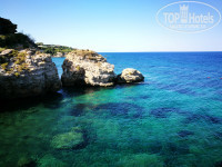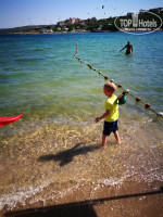 Пляжи отеля- наш самый любимый был ближе к нам, который самый красивый с водопадом в низине. На нем примерно 25 лежаков, кажется в 3 ряда. И конечно что бы занять там место приходилось встать пораньше. Я люблю вставать по раньше, что бы полюбоваться восходом и тишиной. Поэтому в 6 утра я уже занимал лежаки в первом ряду, любуясь рассветом. Цвет воды и чистота моря конечно впечатляют. )) Есть маленький пляжик для деток с песочком, искусственный, но очень красивый водопад и к сожалению холодная вода. Мы то с женой быстро привыкли и без проблем входили в воду, а вот с ребенком каждый заход в воду с бубнами. Я любитель снорклинга по этому изучал подробно подводный мир. Рыбок встречается много разных (их подкармливают с берега хлебом), крабов не видел, медуз нет, чем ближе к буйкам, тем больше появляется ежей морских на дне. В месте захода в воду ежей нет, можно смело идти. Второй пляж находится на настиле деревянном так же на скале. Там не купались ни разу, так как для ребенка спуск совсем не удобный по лестнице, и там сразу глубина. Третий пляж это смесь пляжа городского с отельным. Да, везде песочек, много лежаков, занимай какой хочешь. Первый ряд лежаков обычно уже занят. Вода мутная, народу очень много. Но там хоть можно ребенка одного выпустить поиграть в песке. Мусор есть конечно, но не критично. На этот пляж ходили раза 3 всего.