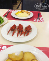 ужин: были роллы, были крабы, осьминоги, кальмары, были овощи на гриле, макароны, картофель, курица или индейка, фрикадельки