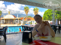 На пляже работает бар(вода, кола, фонта, спрайт, соки, чай, кофе, горячий шоколад, пиво и все такое , и так же там открывается снек-бар ближе к обеду( фри/гамбургеры)