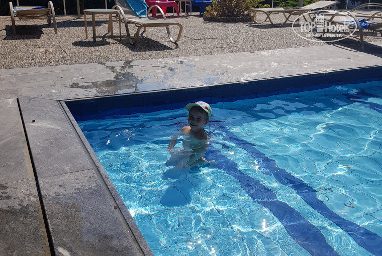 Без излишеств. Бассейн для взрослых (около 10х20м и глубиной от 0.75м до 1.6м) с лежаками по периметру. Лежаков всегда хватало, но мы не любители лежать у бассейна, больше у моря находились. Бассейн для детей 0.45м глубиной. Из минусов –не организован вход в детский бассейн, просто нет ступенек, сразу шагаешь на глубину 0.45м, это как вообще сделать 3-х летнему ребёнку??? (но благо мы справились). Взрослый бассейн закрывается после 18ч, а так хотелось бы часиков в 20 после ужина охладиться.