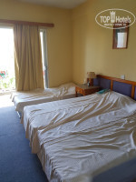 В номере было две большие кровати, состыкованные между собой и одна современная раскладушка приличного вида. Дочка сразу выбрала её – ей понравилось спать. Две прикроватные тумбы с ночниками, кресло, столик журнальный с чайником и чайным набором (сахар, чай, кофе), стол с большим зеркалом, а также специальная подставка-стол под чемодан. Шкаф для одежды с вешалками и подсветкой (что очень удобно). На балконе пластиковый столик с двумя пластиковыми стульями. Верёвок для белья нет! Очень рекомендую взять верёвку из дома с прищепками и натянуть на балконе – мы так и сделали – мегаудобно!!! На полу в номере ковролин и из-за высокой влажности в номере пахло сыростью.Из техники в номере: телевизор (не включали его), кондиционер, чайник, фен, холодильник (платно –считается 1€ в сутки до выселения).