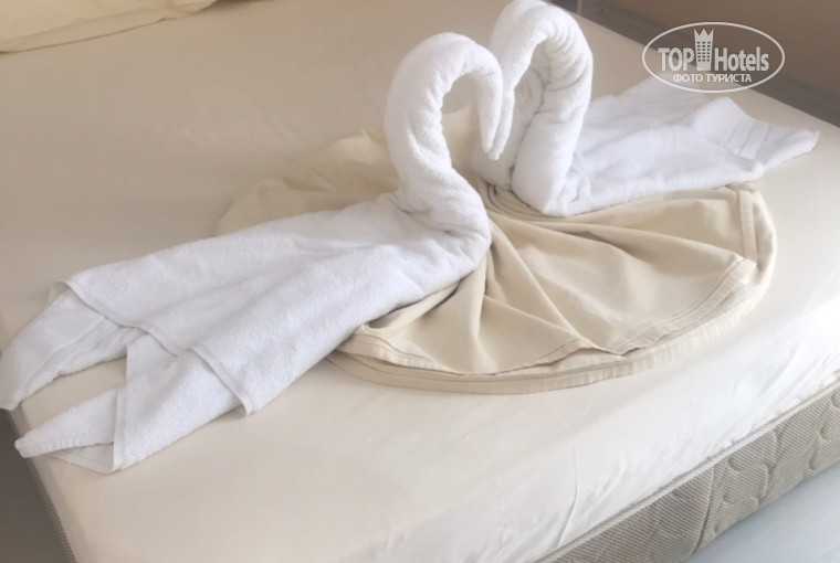 3. Уборка. Тут вопросов нет. Очень приветливая уборщица была. Милая женщина. Убирались через день. Сделала даже пару раз нам лебедей из полотенец и сердечко с живыми цветами. Очень красиво. Уборка на 5+. (Кстати про воду. Как и писали многие. Бутылка одна в холодильнике, потом можно набрать воды из кулера в коридорах. Мы купили 5л за 1 бакс в торговых рядах.)