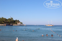 На пляж ходили пешком. В 9 утра было много свободных лежаков. Мы не жарились под солнцем, больше купались и прятались в тени. На нашем пляже можно бесплатно попить воду, кофе, чай и "сокоподобные" напитки. Жалко, что не было пива, но как-то мы пережили этот негативны момент))) Купались подолгу, видели крабов и разных рыбок, разглядывали дно (брали очки и маски). Нам было тяжело заходить в воду через полосу крупной гальки. Но мы нашли "тропинку" без камней левее нашего пляжа. И еще там же есть специальные деревянные мостки с перилами, по которым можно спуститься в воду.