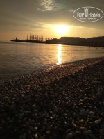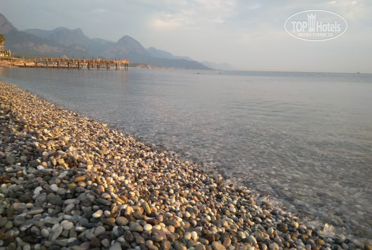 МОРЕ. Теплое, галька, обувь резиновая для входа обязательна. Мы коралки с собой не везли, а зря. У меня высокий болевой порог, но ходить босиком реально больно. Пришлось покупать аа месте, благо там этого добра хватает и недорого. Читала про занятые лежаки и думала, что уж нас-то это не коснется, ведь летим в конце сезона. Но не тут-то было. Придя в 8 утра, в первый день еле нашли лежак. Потом уж мне не спалось по утрам и я ходила бросить вещи, чтобы занять, но это было раза два, так как отдыхали в других местах. К слову, часов в 11 ночи перед сном мы приходили к морю, и уже в это время процентов на 20 лежаках лежали – лопаточка, крем, шлепка, реже полотенце, но самые оригинальные клали камушки. Эти камушки с легким свистом улетали в море. Надеюсь, это не были чьи-то именные личные слитки? Руководство отеля лишь развесило везде объявления о недопустимости подобного, но никто ничего не делал. Вообще, даже не знаю, есть ли там кто, отвечаюший за порядок, лежаки? Я никого не видела. Лежаки вечером никто не выстраивал в ровные, как в других отелях, ряды. Даже многоупомянутого управляющего Османа я может и видела, но не знаю как он выглядит. Так что если он и помогал кому, для этого, наверное, нужно было жить на рецепшене. Вход в море вначале немного пологий, но глубина начинается в паре метрах от берега. Слышала, как люди жаловались на укусы рыбок. Вода держит замечательно. Можно просто лежать на спине и дремать, волны там редкость. На пляже есть переодевалка и душ, туалет в отеле рядом с рецепшеном, и напротив бара (М- 1 этаж, Ж- - второй).