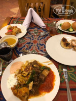 Еда в отели нормальная.Выбор не большой,но вкусно.Голодными не останетесь.Всегда есть курица,скумбрия,говядина,телятину,мидии и крабов давали один раз.Рыбный пирог был,рулетики разные мясные,десерты вкусные.Единственный большой минус-это очереди.За омлетом приходилось стоять 20 мин.за пончиками и блинами очередь тоже,но меньше.Если хочешь колбасы или сыра тоже придется постоять. их выдают те повара которые на омлете и пончиках. Такие же очереди за пастой вечером.Если придти к 10 утра,то уже мало чего останется.Наверно отель был заполнен. Алкоголь был нормальный,пить можно.