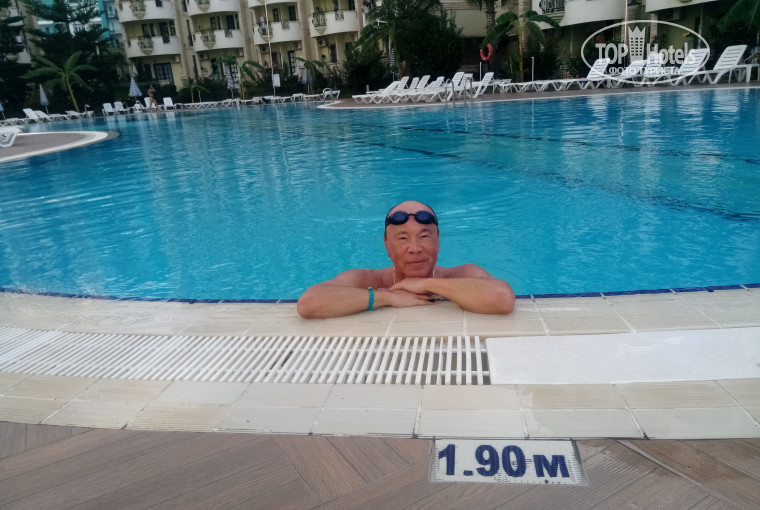 Отдыхали с супругой с 9.10. 19 по 24.10.19 в этом отеле. Как водится, прочитали отзывы, и слегка приуныли. Целая группа с Нижнего Новгорода опустила отель ниже плинтуса. Не буду цитировать все гадости, описываемые ими. Но билеты взяты, ласты упакованы, карманы забиты долларами. В путь! Добирались долго, чуть больше 3-х часов ,более 150 км. Провинция Мухматлар- самая южная в Алании. Зато гарантирована хорошая погода, отсутствие дождей и штормов, с апреля по ноябрь хорошая погода. Получить хороший номер с шикарным балконом и правильным этажом– 20$ Про это мы знали, т.к. не в первый раз в Турции. Вообще, заселение прошло без сюрпризов! - Питание обычное, как в других отелях эконом класса. Кстати, для пьющих- бар работает до 2-х ночи. Это даже в отелях Super AL не всегда бывает. Приезжаешь с дискотеки в Алании, а бар еще работает. - Шума по ночам нет, мероприятия расположены в спец.отведенном месте. Легкий фон от трассы, пролегающей вдоль моря. - Море хорошее, теплое и чистое . Это от того, что дно каменистое. Заход в море соответственно сложный. Но для плавающих проблем нет. Бара на пляже, как такового, нет . Можно выпить кофе с автомата. Туалета тоже нет. Но отель через подземный переход. И там есть все. Анимация нормальная, По вечерам Мистер и мисс Отель, семейная пара, турецкая ночь, караоки. Кто не в первый раз- знает, о чем речь. Про детскую ничего не могу сказать.