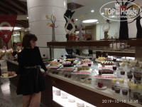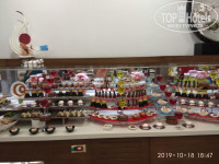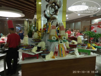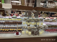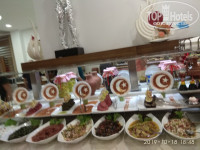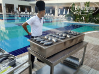 нас полностью устроило питание. Для младшей дочки всегда находила, что покушать. Были диетические блюда (в ресторане два подноса в уголочке,где выход на кухню), всевозможные гарниры-рис, макароны, брокколи, картофель,пюре. Из мяса была телятина, курица, индейка. Каждый день были блюда на гриле(их готовят на улице). По понедельникам рыбный день, готовили кальмаров, местные роллы (не вкусные на наш взгляд), креветки, рыба (форель,морской окунь, скумбрия, селёдка, один раз был тунец). Ну, сладкое,как и везде- выше всяких похвал, я все не попробовала даже! Из фруктов в наш заезд были дыни (не сладкие), вкусные яблоки, бананы, виноград, сливы, мандарины и апельсины. Кофе отличный из автоматов. Сок порошковый, но пользуется спросом у людей,значит ничего. Мороженное выдавали каждый день у бассейна с 14-30 до 16.
