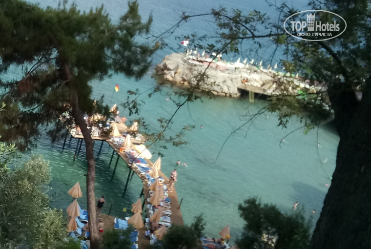 Пляжа в отеле НЕТ, есть только пирс. Чтоб спуститься к этому пирсу вам придется преодолеть примерно 50-60 ступенек(точно не помню). Туалета на пирсе нет((( Сами понимаете, куда народ справлял нужду.
