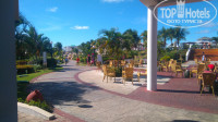 Большая ухоженная территория с пальмами , подстриженными кустами, и цветами…