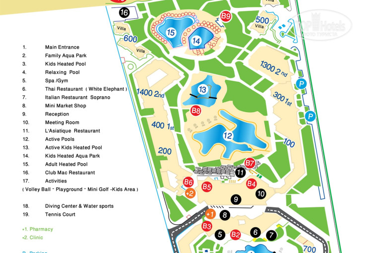 Территория: очень большая, чистая, ухоженная, много зелени, необычные деревья, ночью красиво освещается, в отеле дают карту территории отеля, около 10 бассейнов (из них 3-4 обогреваются в зимний период), есть много горок для взрослых и детей, большое количество шезлонгов/пляжных кресел (в том числе двухместных), гольф, теннис, бильярд, экран/телевизор на улице (вечером на нем показывают мультики и футбол), театр возле пляжа, качели, игровая комната. Каждый день территорию отеля убирают.