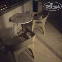 На балконе: светильники, стол и 2 стула.