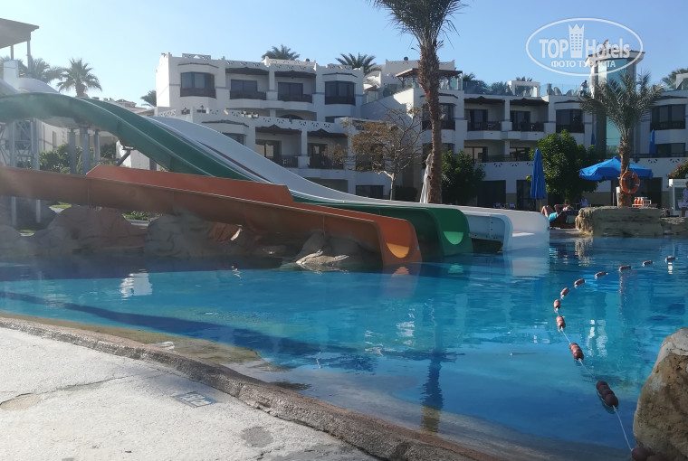 Территория, довольно большая и очень зеленная. Несколько бассейнов, один с подогревом, лежаки найти не реально, если только занимать с утра, три водных, небольших горки, но вода очень холодная...
