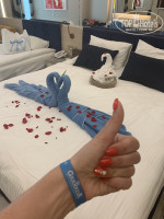Заселение: Приехали около 9, заполнили анкеты, одели браслетики и отправили на поздний завтрак. После завтрака прогулялись изучая территорию и в 12.30 нам сказали что номер готов))).