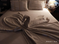 Заселили нас в 14-00,в два соседних замечательных номера-дуплекс,в номере есть все необходимое-вместительный зеркальный шкаф,сейф(платный,но мы не пользовались,убирали деньги и ценные вещи в чемодан под замок),в ванной комнате большая раковина ,душевая кабина,унитаз,все чистое,выглядит как новое.В ванной были гели для душа,бальзам для волос,шампунь,мыло,пополнялись горничными по мере необходимости.Сам номер двухэтажный,на первом этаже две полуторные кровати,очень легко можно сдвинуть,хорошие матрасы,подушки,чистое белье,мини холодильник(в нем несколько бутылок воды без газа),туалетный столик,плоский телевизор,показывал несколько русских каналов.Есть чайник,чашки,пакетированный чай,кофе 3 в 1,сахар,тоже пополняли когда заканчивалось. Кондиционер работал исправно,нам выдали две карты,и одну мы оставляли в номере чтобы по возвращении было прохладно.Балкон выходил в сторону рынка,на нем сушилка для белья,столик и два стула,приятно посидеть вечером любуясь природой.