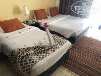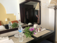 По приезду в отель попали в зону рецепции. Впечатления, на нас, она не произвела… маленькая и довольно скромная, бар в ней не работает Заполнили документы, нам дали конверт с номером и портье повез наши чемоданы и повел нас показывать номер. Территория и номера отеля выполнены необычно, в виде египетского поселка. Дорожки, на первый взгляд запутаны и бессистемны. Каждый номер, я бы сказал «бунгало» имеет отдельный вход. У нас был номер суперриор, он имеет превосходную закрытую террасу, в которой стоит диванчик и столик. В самом номере одна двуспальная и одна односпальная кровать, столик, холодильник, шкаф, телевизор – в общем стандартный египетский набор. Телевизор 26 дюймов, но на нем было всего 8 каналов, из них: украинских – 0, российский – 1 и он был без звука (два раза ходил рецепшен с просьбой добавить кол-во каналов и настроить звук. Только на 3 день восстановили звуковую дорожку по российскому каналу, украинских каналов так и не сделали). Кондиционер в номере работал хорошо. В санузле унитаз, биде, душ, умывальник. Сантехника – НОВАЯ!!! Мыло и гель для душа – наливают в диспенсеры. В связи с карантином пляжные полотенца не выдают на пляже, а находятся в номере в пакете, при заселении. Скажу сразу, пляжными полотенцами их назвать нельзя – застиранные тряпки серого цвета с бахромой. Более того Вам придётся их носить с собою весь свой отпуск, так как их не меняют на пляже. Постельное белье, в номере, также на 4 ку, к банным полотенцам претензии не было. В номере также огорчила грязная тюль.