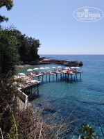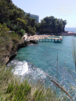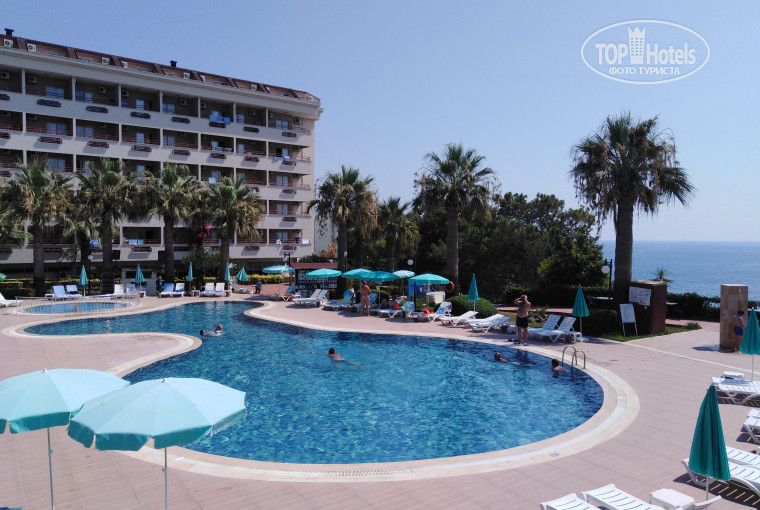 3 корпуса, магазинчик сувениров, магазинчик с кожей, спа (хаммам), фото услуги, спорт площадка(для тенниса, баскетбола), бассейн взрослый, детский, для горок, 2 горки, амфитеатр, ресторан, детская площадка, мини клуб (не работал), диско (снэк бар), бары (лобби, у бассейна, снэк). Всё очень зелёное, растения ухоженные, вид потрясающий. Со всех номеров есть вид на море(даже на первом этаже). Отель находится на возвышении, к морю нужно спускаться по лестнице. Пляж отеля-платформа, плюс лежаки установленные под навесом при спуске к морю.