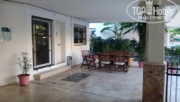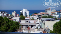 Отель представляет собой два крыла, соединённые под острым углом вокруг бассейна. В левом крыле номера поменьше, в правом - побольше. Вид с балкона на бассейн, номера правого крыла выходят на террасу с видом на море. На самом высоком пятом этаже правое крыло заменено террасой, так что там все номера с видом на море.