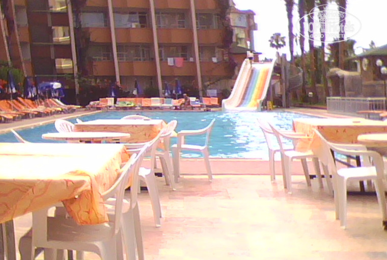Минус - еда. Очень уж однообразно. Но это не помешало мне отъесться кг на 3-4 :(( За мясом по ужинам сначало жуткие очереди! Мы стали приходить в 8 вечера, - и без очередей. На обед, ужин, жидкие супы, как всегда в Турции салаты, овощи, были отварные макароны часто, и рис и картофель. В автоматах - чай, кофе, соки эти юппи как обычно. Также о обычная вода прохладная. Все туристы подходили и набирали её в бутылки свои - что удобно, чем со стаканами подбегать каждые пол часа. Стаканы моют ужасно - то помаду на свойм обнаружила, то отчётливый привкус чьих-то духов. Совет - заведите один бокал с ним и ходите всегда, чтобы в него вам наливали. С напитками и пивом все спокойно ходили в свои номера - хоть якобы и запрещено, но можно. Отель находится прямо в жилом посёлке Конакли, конечно это плюс - и погулять, и шопинг. До моря идти с отеля совсем недалеко - по нормальненькой такой дорожке. Дорогу переходить не надо. В баре на пляже пекут лепёшки - но только одна тётя на весь отель! Конечно - очереди!!! В 12 часов там же начинается снек-перекус. Т.е. фастфуд - спагетти, соус, картошка фри, но и в 12 начинается обед. Я ела в этом баре обычно, а через час шла и на обед :)) Пиво как везде - Ефес, светлое, приятное, и после стаканов пяти я даже чувствовала, что это всёже алкоголь, а не компот :))