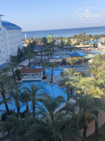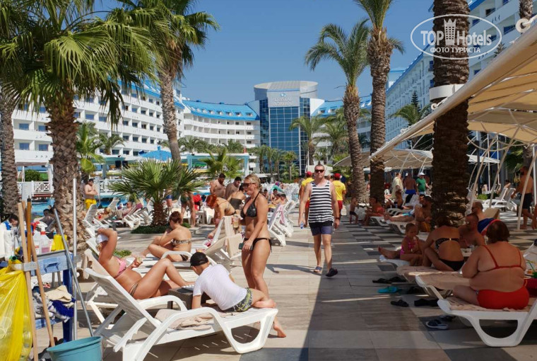 О питании. К сожалению там настолько разнообразно предложение что я не о всем могу рассказать. Расскажу о чем знаю. Главный ресторан — большой зал с столиками, рядом зал с раздачей. Питание разнообразное. Не буду всего перечислять так как сделать это физически не смогу, сам за 10 дней всего не перепробовал. Завтрак — оладушки с джемом, омлетики, яичницы, оливки, овощи, сыры, чай, кофе,колбаса, сосиски, хлопья-шарики с горячим и холодным молоком,булочки, сендвичи. Обед — супчик — салатики-мясо-гарниры. На ужине открывается гриль на улице. Три раздачи — птица, рыба, мясо с мангала. Также на ужине подаются фрукты — персики (классные), арбузы, дыни,яблоки,китайские финики (зизифус) , киви, апельсины, бананы. Вода в одноразовой упаковке — везде. После обеда с 14 до 16 мороженое. Вообще, весь день- сплошная раздача пищи и если в одном месте что то временно закрылось то в другом месте что то обязательно откроется, но по большей части , все это работает вместе. Лишь несколько раз видели то, что часто встречали в турецких отелях ранее — салатов из непонятных овощей оставшихся ( возможно, не утверждаю)с предыдущей раздачи, приправленных огромным количеством местного йогурта. Что прискорбно, дети наши, в основной своей массе, на завтрак, обед и ужин едят картофель фри с кетчупом. В перерывах эту же картошку едят в баре на пляже запивая химозой.. О чем думают родители? Непонятно.
