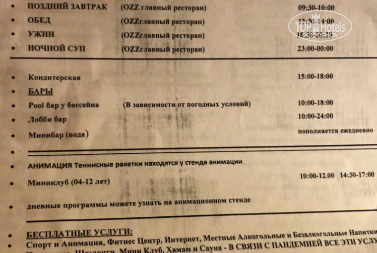 Питание: отличное. Огромный выбор. Мясо, курица, индейка, рыба. Салатов море. Завтрак с 7-30 до 9-30. Поздний завтрак - с 9:30 до 10:00. Обед с 12-30 до 14-00. Ужин с 18:30 до 20:30. Поздний обед (суп) с 23-00 до 0-00.