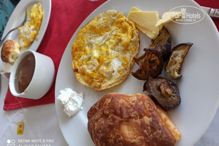 Питание: завтрак стандарт-омлет, слойка, сыр мягкий, сыр твердый, их колбаса, огурцы, сладкий перец, их соленья, капуста разная, фасоль, молочка двух видов, гриль баклажаны