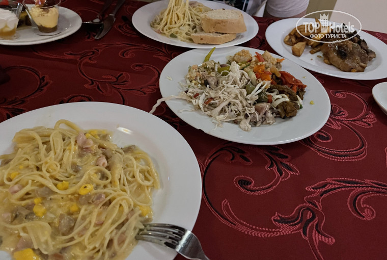 6) питание на любителя , выбор есть , но иногда уходили голодными, из фруктов - зелёная дыня, ананас если успеть, бананы, из овощей - морковь , свекла , капуста всегда. огурцы если успел , с помидорами вообще беда , то зелёные , то их нет. Приборы и напитки приносили официанты , понятие ложка - тяжёлый случай , пока дождёшься уже суп остынет , из напитков в главном ресторане - алкоголь рекой, из остальных как повезёт , алкоголь я не пила , так мне вообще было туго, спрайта , колы почти никогда нет , чая, кофе нет ( либо только по утрам) из соков - юпи, галимый краситель. Бывало такое что мы заказывали на завтрак чай и в итоге его не дожидались. На мой вкус выпечка и хлебобулочные изделия невкусные, мука самый низший сорт видимо.