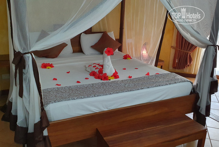 Территория отеля большая и очень ухоженная. Управляющие итальянцы, хорошо следят за сервисом и обслуживанием. Заселились в номер около 12:00. Ваши вещи донесет массай, приготовьте ему на чай заранее, иначе будет до упора стоять с вами в номере в ожидании чаевых. Бунгало в отеле двухэтажные, по 4 номера на этаже. Наша Комната 1706 - просторная, чистая, с дополнительной кроватью и классным видом с балкона на бассейн. Санузел достаточно чистый, порадовала душевая кабина. Смесители и тропический душ повидали жизнь, но работают исправно. Напор воды хороший, 2-3 раза случались перебои с электричеством. Постельное белье хорошее, полотенца меняют каждый день. Удобная кровать, но от подушек на третий день разболелась шея. Две бутылки воды ставят каждый день, но могут и забыть. В номере есть небольшой холодильник, слабенький фен, набор из шампуня и геля для душа. Сейфа нет, они находятся на ресепшн в общей комнате под видео наблюдением 24/7. Мы им не пользовались, оставляли деньги в чемодане под замком. Нет телевизора, чайника и чайного набора. Интернет медленный, но отправить фото по вотсап можно. Часто приходилось логиниться заново, сохраняйте фото чека или оригинал, на котором есть логин-пароль. Повторно дадут только за отдельную плату.