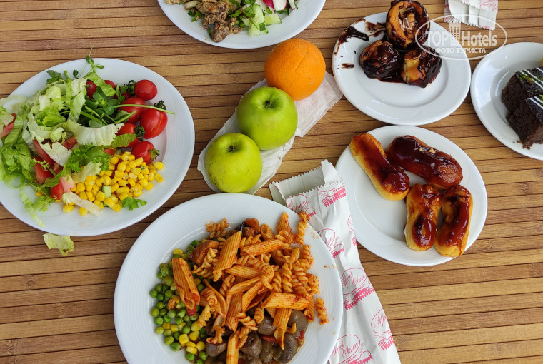 Столовая. Даже в самых дешёвых египетских отелях всегда есть курица и овощи с рисом. А тут!!!???? Про мясо я молчу и не рассчитывали, но курица???? И ее не было никогда!!! Один раз подали ножки, спустя пол часа от начала ужина и маленькую тарелку. А так были пупки, сердечки, печенка и то не каждый день...плюс через день костлявая несъедобная рыба. Чтоб вы понимали РИС- это тоже деликатес , который разбирался за 10 мин. (Если был) , а так каша перловая. Спустя 20 мин от начала приема пищи обычно уже ничего нет совсем... Отсюда вывод, люди чтобы успеть взять хоть что-то стоят под дверью столовой за 40 минут. Чуть не забыла - гриль!!! Один раз были котлеты( с настоящим мясом) и пару раз макароны - разлетались как горячие пирожки! Фрукты всегда в изобилии апельсины и яблоки. Сладкое- бисквиты. Два раза в день ещё есть пицца- то с картошкой, то со шпинатом. Один раз говорят на бассейне давали по две клубничины в руки, и один раз по чайной ложке мороженного.