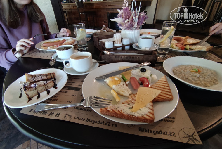 Завтраки тоже очень понравились. Завтрак не формата шведского стол, официанты приносят всем одинаковый комплект. Но очень много и вкусно. Например, один день было тарелка с яйцом и сосиской, овощами, тостами, маслом и нарезкой, тарелка каши и пирог. Кофе и чай неограниченно. Для проживающих входит в стоимость проживания один бесплатный подъем на гору Церковка на канатной дороге при гостинице. Вечером прогуляться есть где, мы гуляли вечером по 2 часа, у кого есть желание можно гулять и по терренкурам. Стоит заметить, что в Белокурихи территории санаториев открыты и можно свободно гулять. В общем, рекомендовать буду знакомым Благодать, мне понравилось).