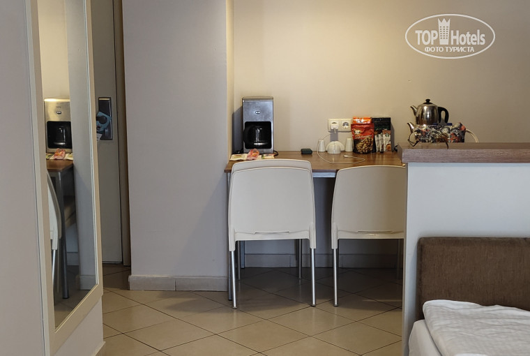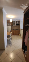 Номер: большой, просторные, на фото можно оценить, разделен на две части, между комнатами дверь, очень большой балкон, на который можно попасть как из гостиной, так из спальни. Имеется кухня для тех кто хочет что-то приготовить для себя самостоятельно. В номере имеется посуда: тарелки, вилки, ножи, кофемашина (не пользовались), холодильник (работает исправно, морозильная камера отлично справляется со своим делом), микроволновая печь. Два кондиционера, работают исправно, один в гостиной, другой в спальне. Автоматически откл, если открыта дверь на балкон в любой из комнат. Нас было трое в номере и на ресепе выдали два ключа, один всегда был в номере, для того, чтобы кондиционер постоянно работал, когда нас нет, после жаркого дня (температура была доходила до +41) - прохладная комната просто спасение. Ванная комната большая, есть где развернуться и оставить ванные принадлежности. В прихожей и спальне есть отдельные шкафы для размещения вещей, думаю даже для семьи из 4-х человек место всем хватит. Имеется телевизор, много каналов на русском (ТНТ, 1 канал, ВГТРК, что-то еще, практически его не смотрели). На балконе имеется столик с 3 стульями для комфортного времяпрепровождения вечерами. Окна выходили на задний двор, ночью тишина, спокойно можно посидеть на прохладном балконе.