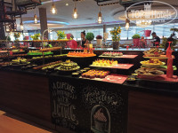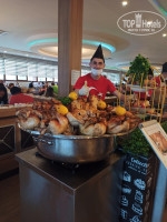 Каждый день разная рыба - форель, судак, окунь, скумбрия, сёмга. По вторникам рыбный день- были вкусные раки, креветки, мидии , запечённая в соли сёмга.