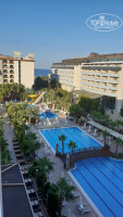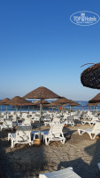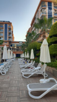Территория отеля не большая, но очень зелёная, 3 бассейна (с горками, детский и большой). До пляжа идти примерно 4 минуты, обойти один отель и на месте, там тоже есть бар с напитками (пиво, спрайт, фанта, кола, сок, вода) и снек бар. На пляже людей мало, поэтому лежаков хватает всем, есть еще лежаки на пирсе, оттуда лучше заходить в воду, т.к. с берега не очень комфортно. Да и нам не сильно повезло, был шторм несколько дней.