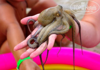 Вода в море была где-то 28 -29 градусов!!! Мы плавали часами. Сын научившийся хорошо плавать на занятиях в бассейне, плавал со мной, как рыбка. Сначала я нырял, доставая ему раков-отшельников и морские огурцы, но потом научил нырять его. Он нашел маленькую красную морскую звезду, небольшого осьминога. Из оставленного кем-то из гостей детского бассейна, мы сделали "аквариум", в который сажали свои трофеи.
