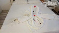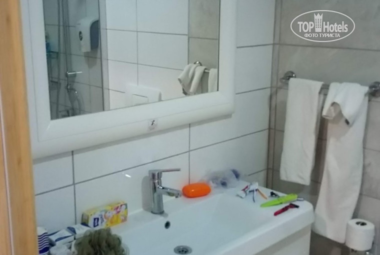 - Номер. Чистый, убирали каждый день, белье меняли, небольшой, но уютный. У нас был номер на третьем этаже с хорошим видом из окна на бассейн и горы. В первый день заселения (точнее ночь, попали мы туда в районе полуночи) белье было ужасно пахло, на следующий день поменяли и все было в порядке. Мебель, двери стены все требует ремонта, все обшарпанное, на телевизоре на нашли не одного канала на русском. В самом "домике", где расположен номер грязновато, на вхоже стаканы и объедки (но то люди сами свиньи).