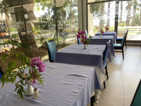 Питание в отеле проходит в главном ресторане. Ресторан большой, столы постоянно застилают чистыми скатертями и украшают цветами, в ресторане есть терраса с зонтами, красивый вид на сад и бассейн.