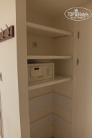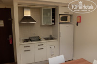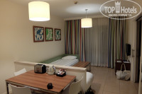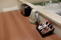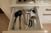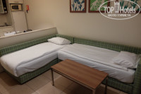 Номера в этом отеле – двухкомнатные сьюты с кухонным уголком. Первая комната просторная, в ней два дивана, низкий журнальный столик, телевизор, под ним тумба. Треть комнаты у входа занимает кухонный уголок, отделённый стойкой. На кухне – среднего размера стол с тремя стульями, большой холодильник (в нём кола, фанта и вода по одной бутылке), над ним микроволновка, раковина, плита. В кухонных шкафчиках посуда – по четыре предмета тарелок, чашек, стаканов, бокалов, ложек-вилок и всякая мелочёвка для готовки типа половника, лопаток и т.д., пара кастрюль, сковородка. Были также чайник, тостер и набор чаёв и кофе. В принципе, можно полноценно готовить еду, у нас было всё включено, практически ничего из посуды не использовали.