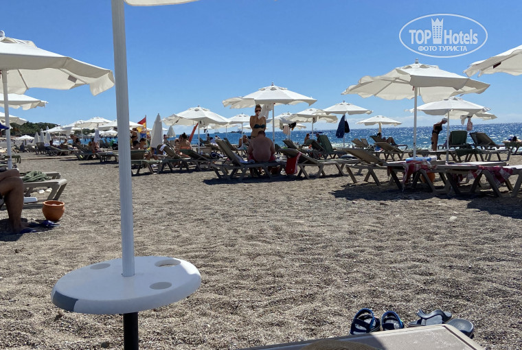 Мы ходили купаться за речку. Там вода спокойнее и чище. Есть уточки. Никого не трогают. Шезлонгов хватало. Мы не сталкивались с проблемами. Шезлонги высокие. Широкие. В мелкую сеточку. Очень удобные.