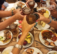 Ресторан довольно просторный. есть места на свежем воздухе. Убирают хорошо, дезинфекция обязательна. В ресторане отеля огромный выбор блюд греческой и интернациональной кухни, в том числе традиционный домашний хлеб, выпечка, десерты и другие деликатесы. Напитки, включая алкогольные, те же, что в барах (и с той же недопонятой мной концепцией!)). Мы пили вино и пиво.