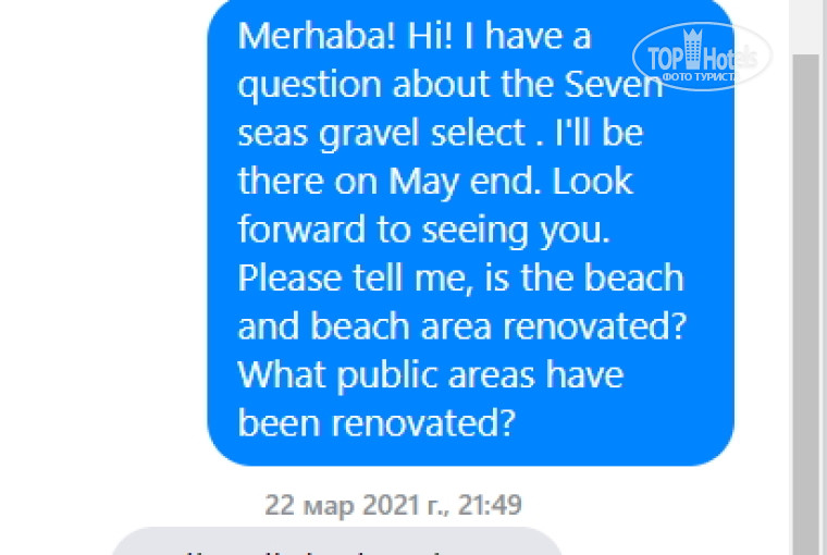 Обман и вранье – вообще визитная карточка гостиницы. Они обманывали, когда отвечали на вопросы на сайте или в Фейсбуке. Мы перед бронированием на май (который был аннулирован закрытием Турции, так что тур был перенесен на осень) спрашивали, реновирована ли территория и пляж – нас обманывали, что да. Скрин приложен. Еще об обмане – сами мы не пьем, но неоднократно слышали, что другие жаловались, что наливают в стаканы совсем не то, что написано на бутылке. И так везде. В трескучих, экстатически восторженных отзывах, написанных словно под копирку – неправда.
