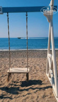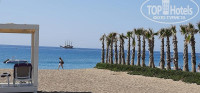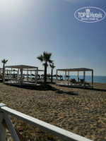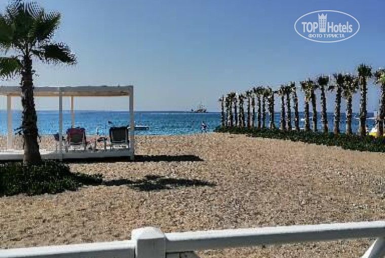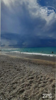 На первой линии, песок с мелкими камушками, при заходе в море мелкие камушки, заход в море кстати не пологий. На пляже и у бассейнов всегда было много свободных лежаков.