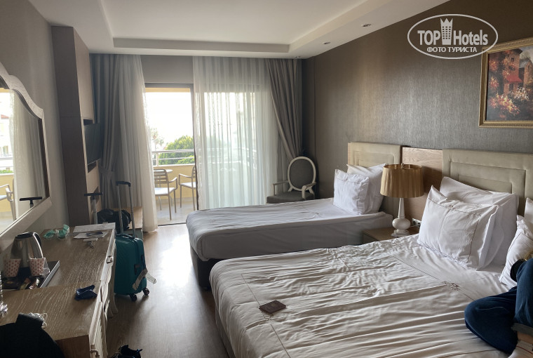 Стандартный номер в главном здании с видом на море. Нам повезло, поскольку это был центральный номер на этаже, так что вид был шикарный. Но если попадётся чуть сбоку – будете смотреть скорее на соседский балкон, а не на море. При выезде прогулялись по другим номерам. В целом, ремонт везде одинаковый, вид из окна тоже. Особой разницы не заметили, кроме как в площади и стоимости, соответственно. Номера не новые, хотя видно, что ремонт старались сделать качественный.