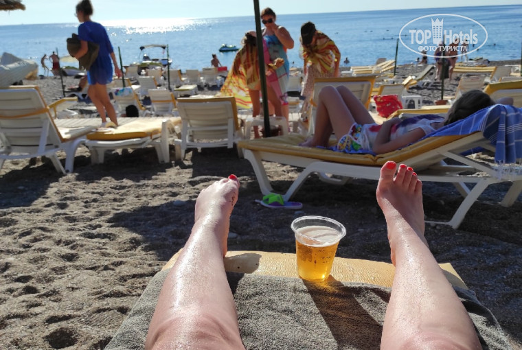 Пляж в основном галька...но это не портит его. Лежаков всегда было достаточно ,несмотря на полную занятость отеля! Бары по всей территории работают в полную силу и там просто всего в избытке, читая другие отзывы вы поймете!!!
