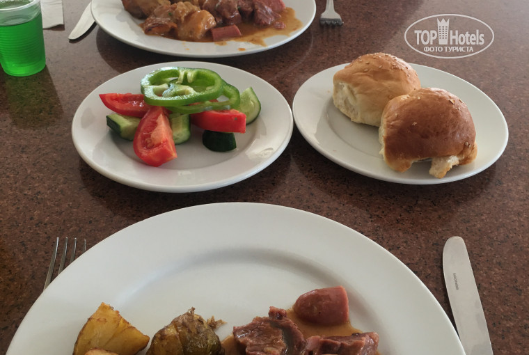 Отдыхали с мужем. Приехали в 10:00, а заселение в 14:00. За 15 $ засели раньше. Это официальная стоимость раннего заселения. Учли предпочтения по этажу (второй этаж просили). Номер достаточно просторный, две 1,5 кровати, трюмо, большой шкаф, стол и стулья, тумба, балкон со стульями и светом, ванная комната. Кровати сдвинули сами и получилась трехместная. Чистота и состояние мебели не идеальное, но соответствует стоимости и звездности. При этом весь стандартный набор для личной гигиены положили и даже больше. Сейф, холодильник, чайник, фен, телевизор работали и были бесплатными. Русских каналов 2. Балкон выходил на бассейн. Пляжные полотенца выдают по 1 на человека по карточкам бесплатно. Карты дают при заселении. Их можно менять хоть каждый день. После выселения обменять обратно на карты и сдать. Обмен у бассейна. Бассейн очень холодный. Анимации и каких-либо других развлечений нет совсем! Вечером включают музыку, чаще русскую. Пьяные люди танцуют самостоятельно. В 11 все выключается и закрывается бар. На баре есть горячие напитки и стандартный Алголь. Пиво местное наливают из бутылок. Стаканчики 0,25 для всех напитков. Постоянно нужно ходить к бару. Можно принести свой бокал. Очень мало столов и стульев, всем не хватало, сидели на лежаках. Стулья можно дополнительно попросить на баре.