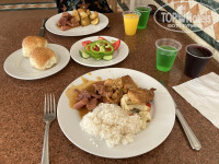 Теперь про еду. Кормили вкусно, но очень однообразно. Были безумные очереди. Люди стояли за 20 минут до открытия столовой. Был закрытый шведский стол. Показываешь через стекло, что тебе положить. Столов не хватало, ели с другими гостями. Меню каждый день одинаковое. Овощи свежие (тут претензий нет, выбор большой, все правда свежее), гарнир: овощи, макароны, картофель, рис. Из мяса курица и говядина, рыба. Все это приготовлено в разных вариациях. Не острое. Фрукты: апельсин, мандарин, айва, дыня, финики. И это все. Десерты: пудинг, бисквитное пирожное, пахлава. Чай только на завтрак, остальное время только порошковые соки.