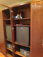 Во входной зоне удобная прихожая, есть место для сумки. В шкафу на полках минихолодильник и сейф, в соседнем отделении утюг и гладильная доска.