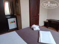 Номер небольшой, но симпатичный. Широкая кровать с кожаным изголовьем, вместительный шкаф, холодильник, телевизор, стильная ванная комната, есть фен.