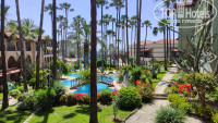 Нас заселили в комнату на 2 этаже в красном здании с видом на релакс бассейн, мостик, красивые цветы, высокие пальмы и море.