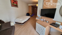 В номере все работает, 2 кондея, телевизор с флешкой (можно взять с собой с мультиками детям и смотреть), 5 Российских каналов с новостями. 4 кровати( можно сдвинуть в спальне и получится одна большая). Вода теплая всегда есть (днем надо немного сливать). Шумоизоляция как везде в отелях - слабая. Слышно всех соседей, кто идет в номер.